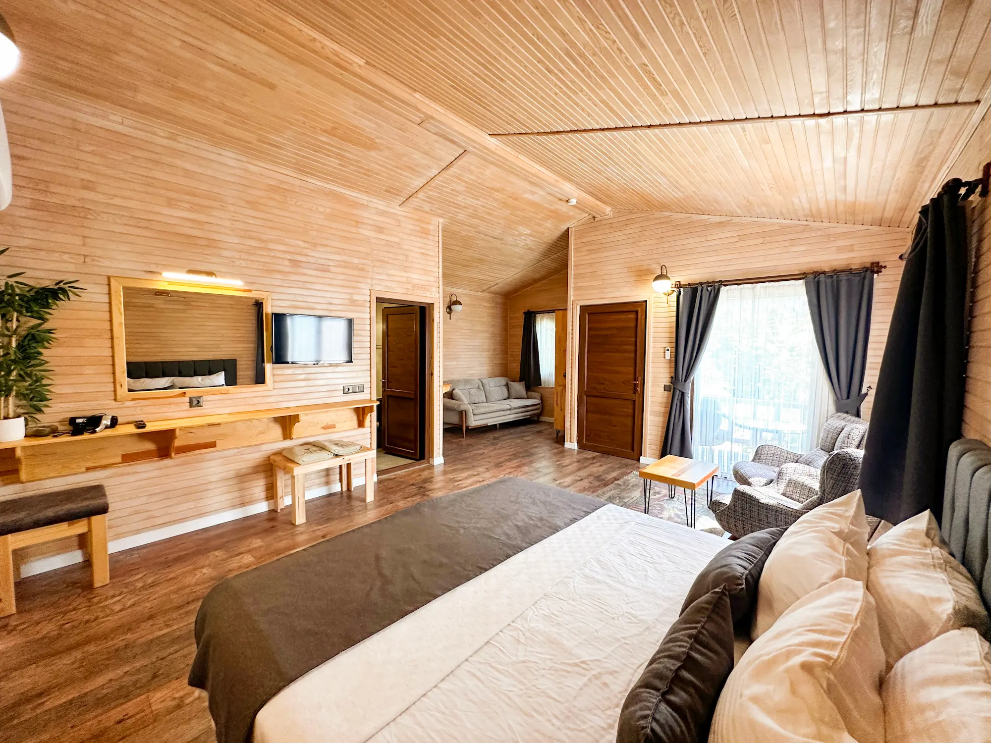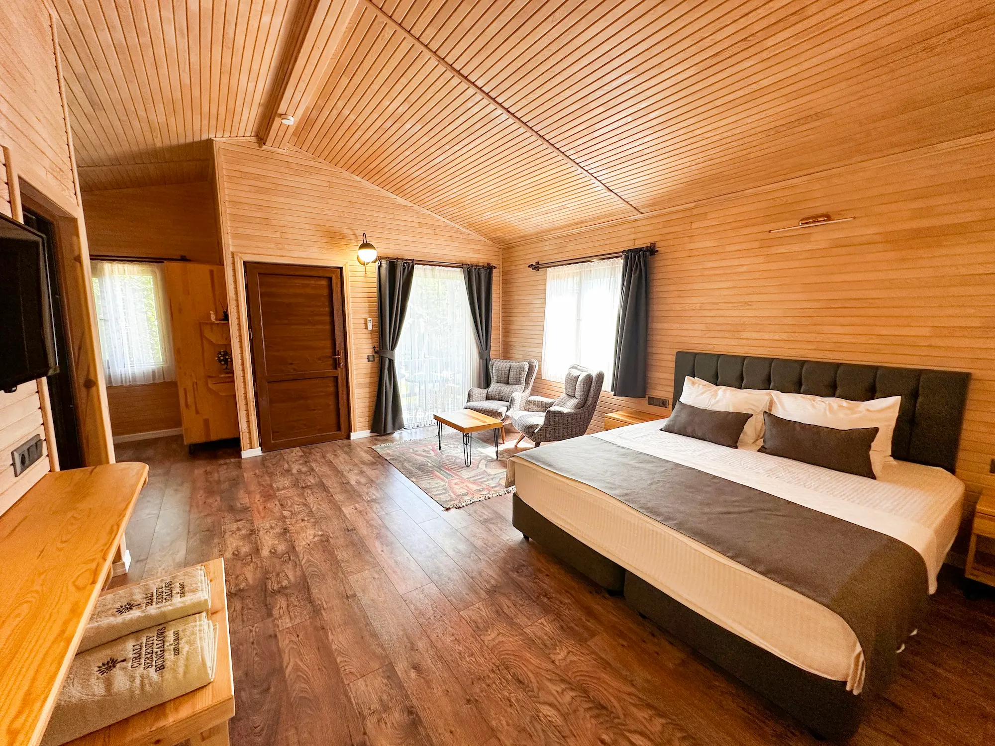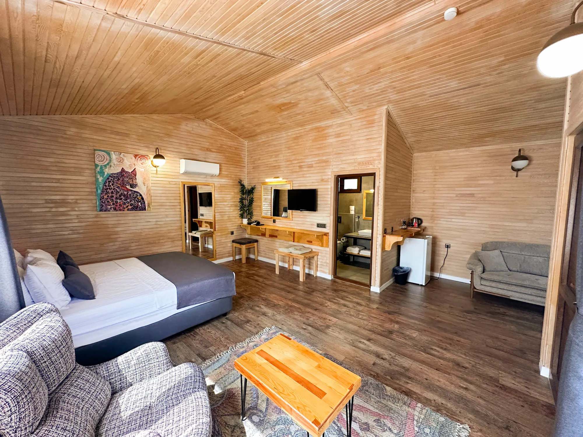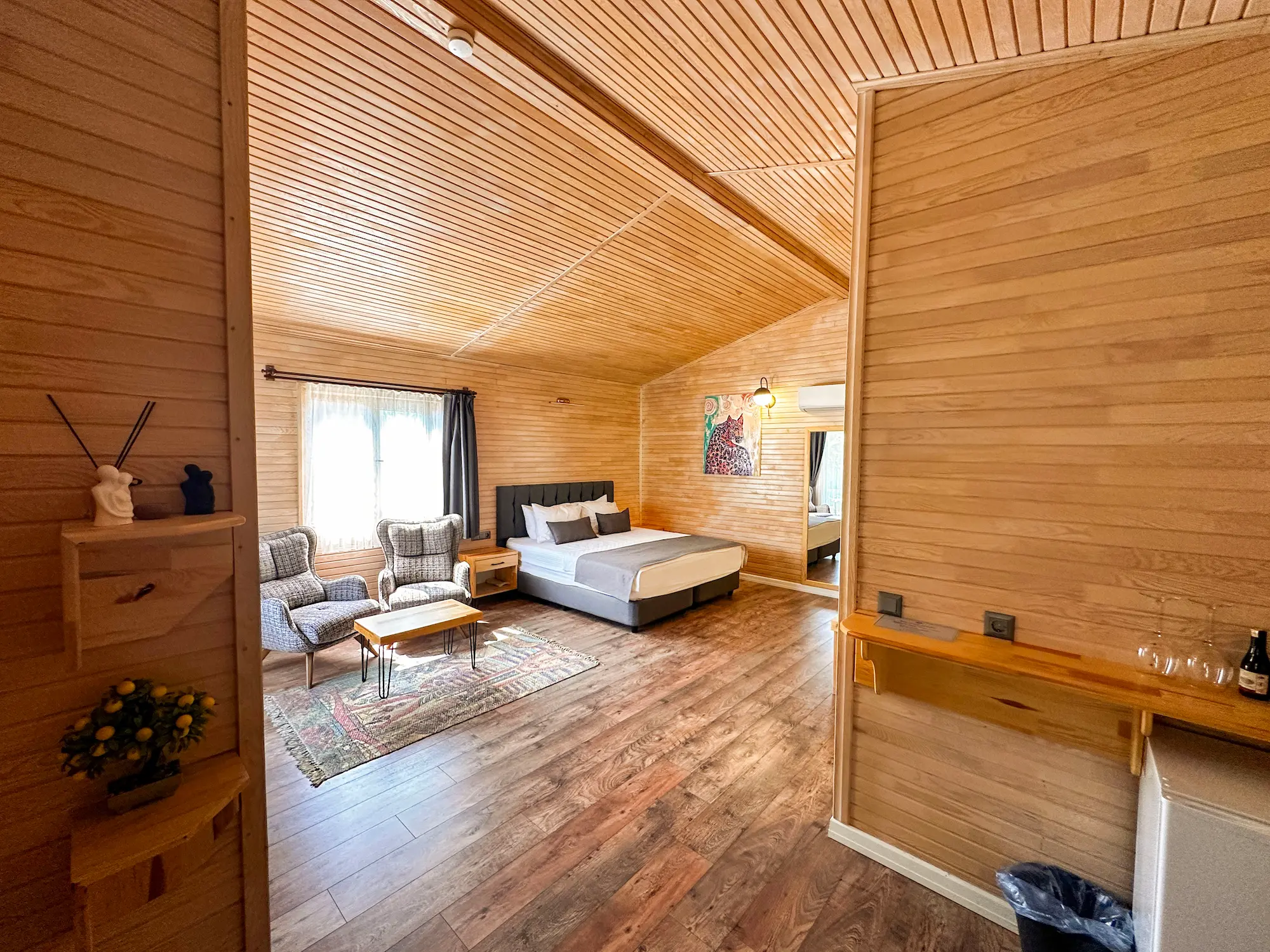 Ahşap duvarlar, gün ışığını içeri alan perdeler ve sessizliği bozmayan sade bir düzen… Burası birkaç günlüğüne yavaşlamak isteyen herkes için. İster dinlenmek, ister kitap okumak ya da sadece biraz durmak için sıcak ve sakin bir alan.