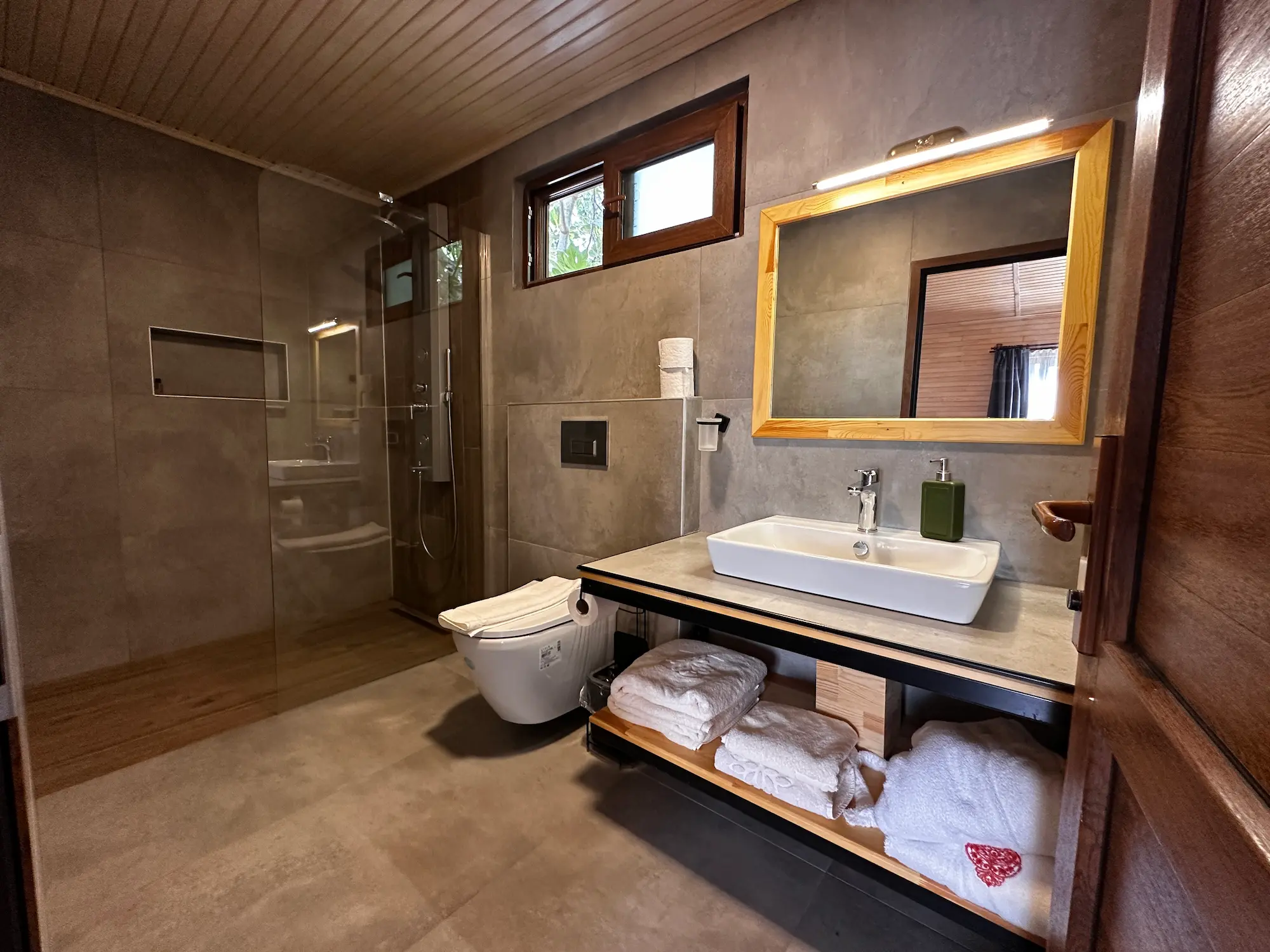 Basit ama düşünülmüş detaylarla donatılmış bu alan, bungalovun pratikliğini ortaya koyuyor. Sade, işlevsel ve tam olması gerektiği gibi.